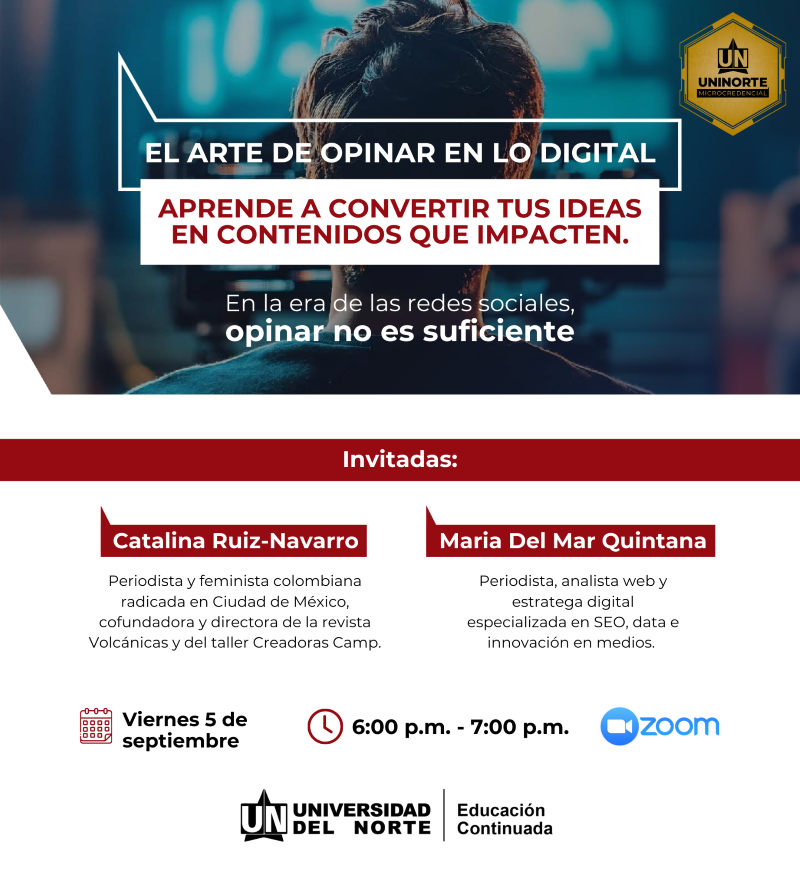 Lo que marca la diferencia es cómo se construyen y comunican esas opiniones para generar un impacto real. Este webinar-conversatorio, con Catalina Ruiz Navarro, periodista y activista feminista, directora y fundadora de Volcánicas, y María del Mar Quintana, periodista y editora digital de EL HERALDO, se realiza en el marco de la promoción de la Microcredencial en Opinión de Impacto: Estrategias, Narrativas y Audiencias Digitales, de la Universidad del Norte.